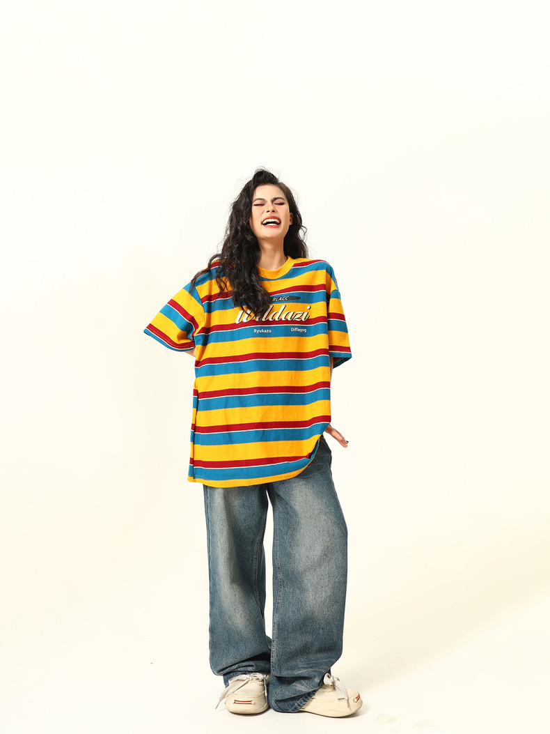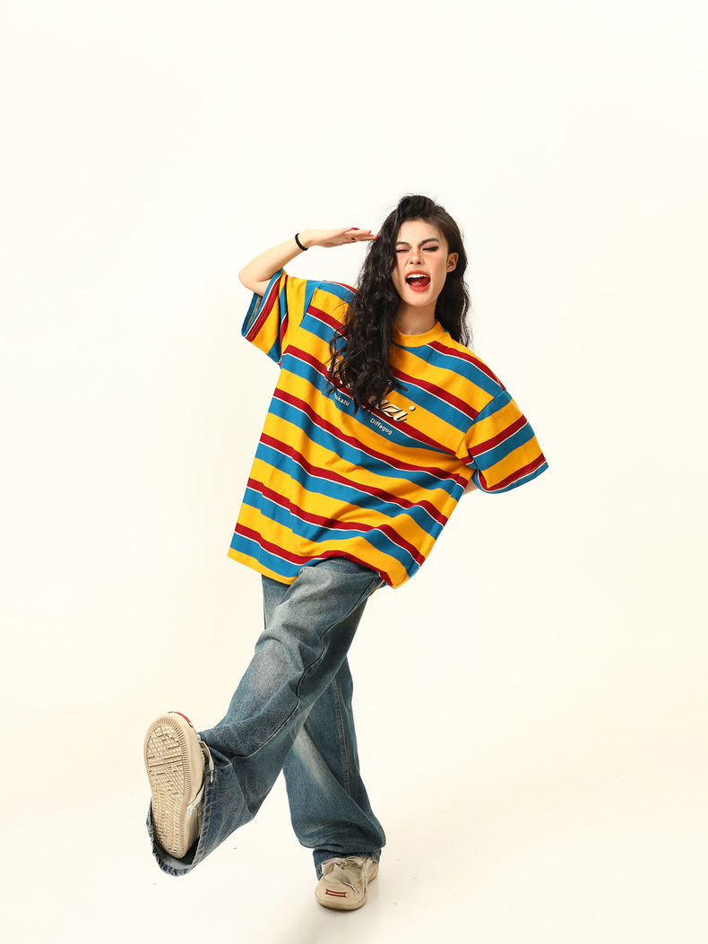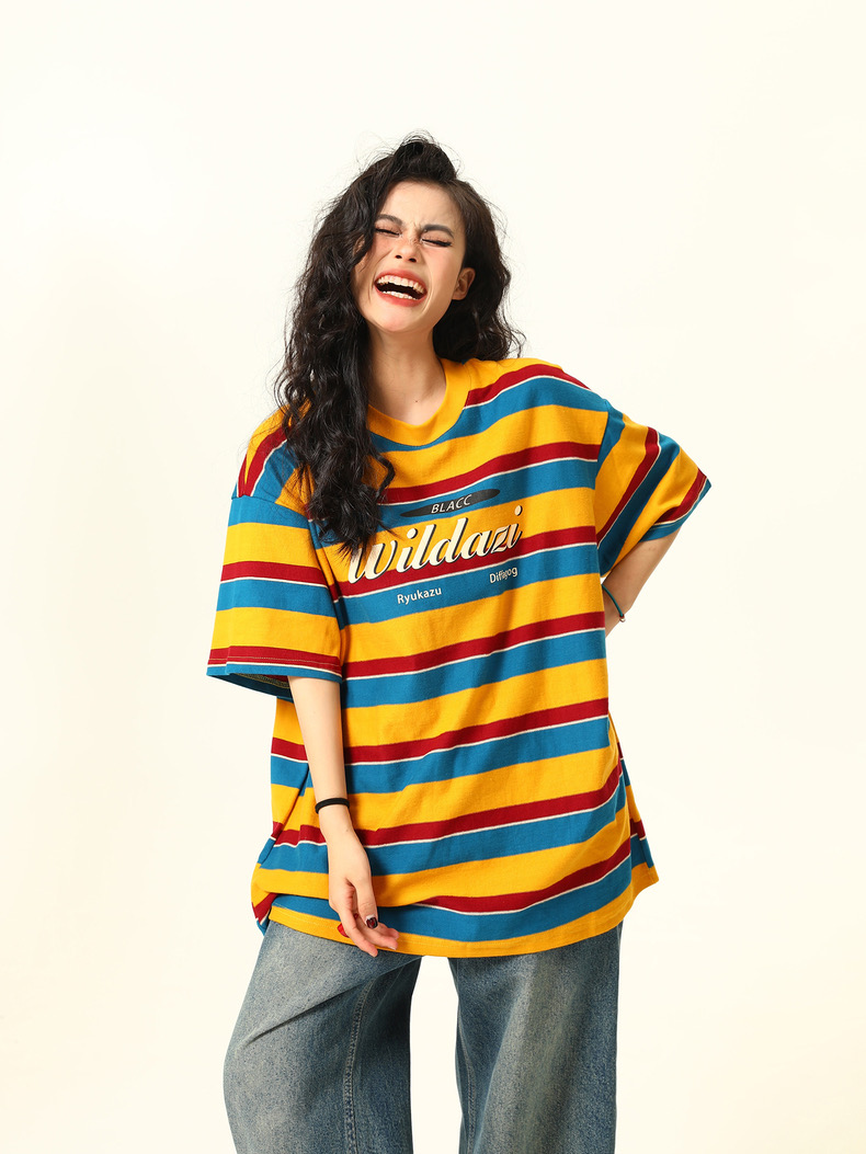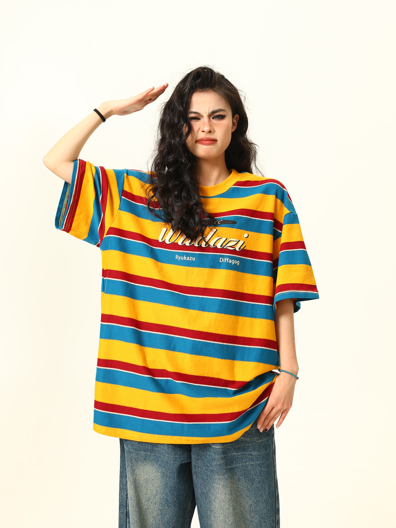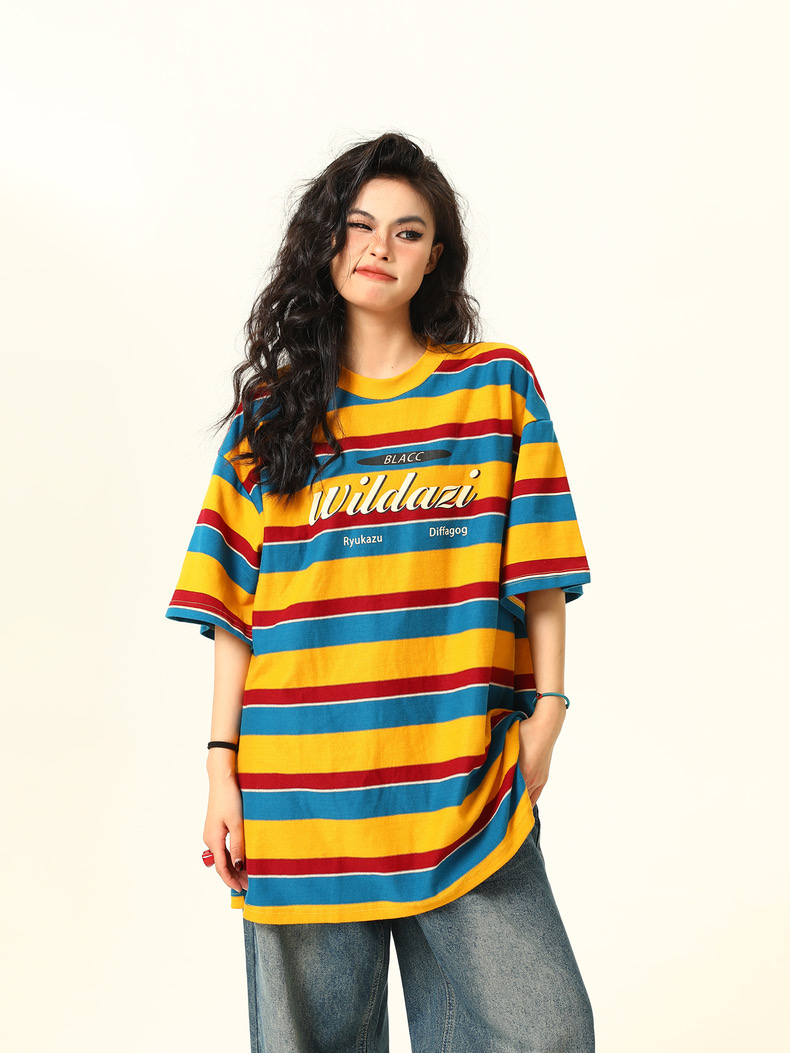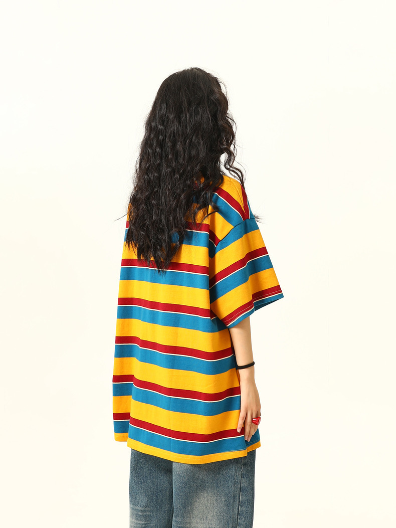 美式復古彩虹條紋短袖T恤女撞色氛圍感夏季寬鬆上衣