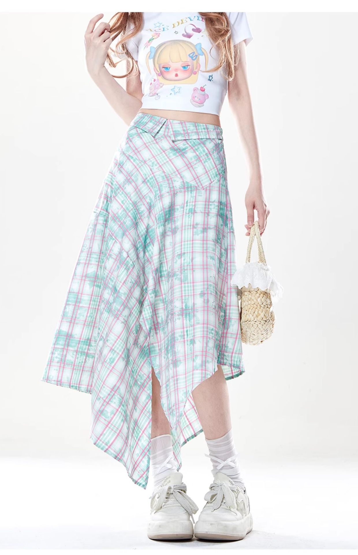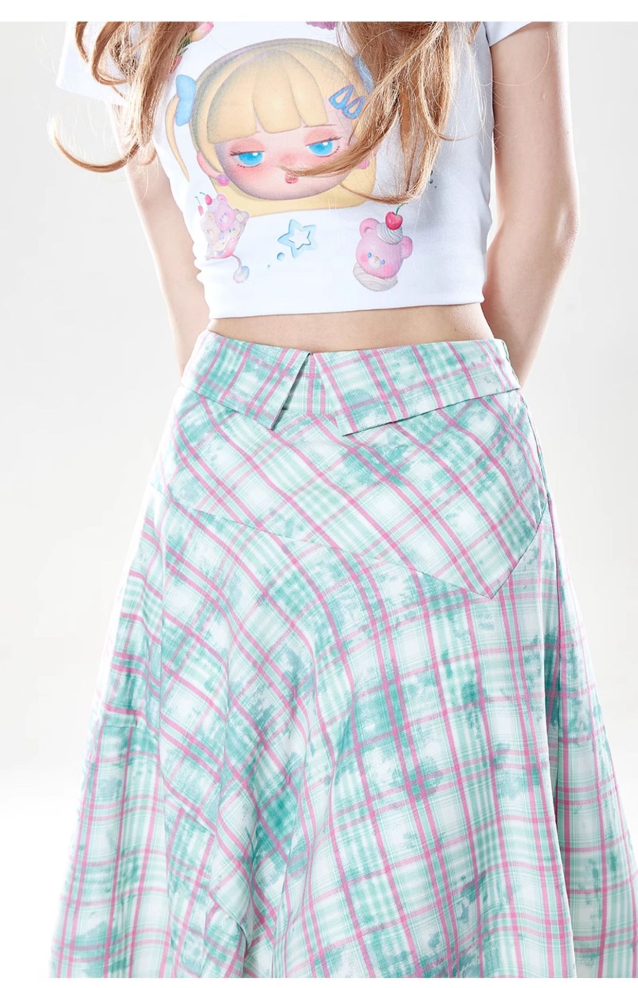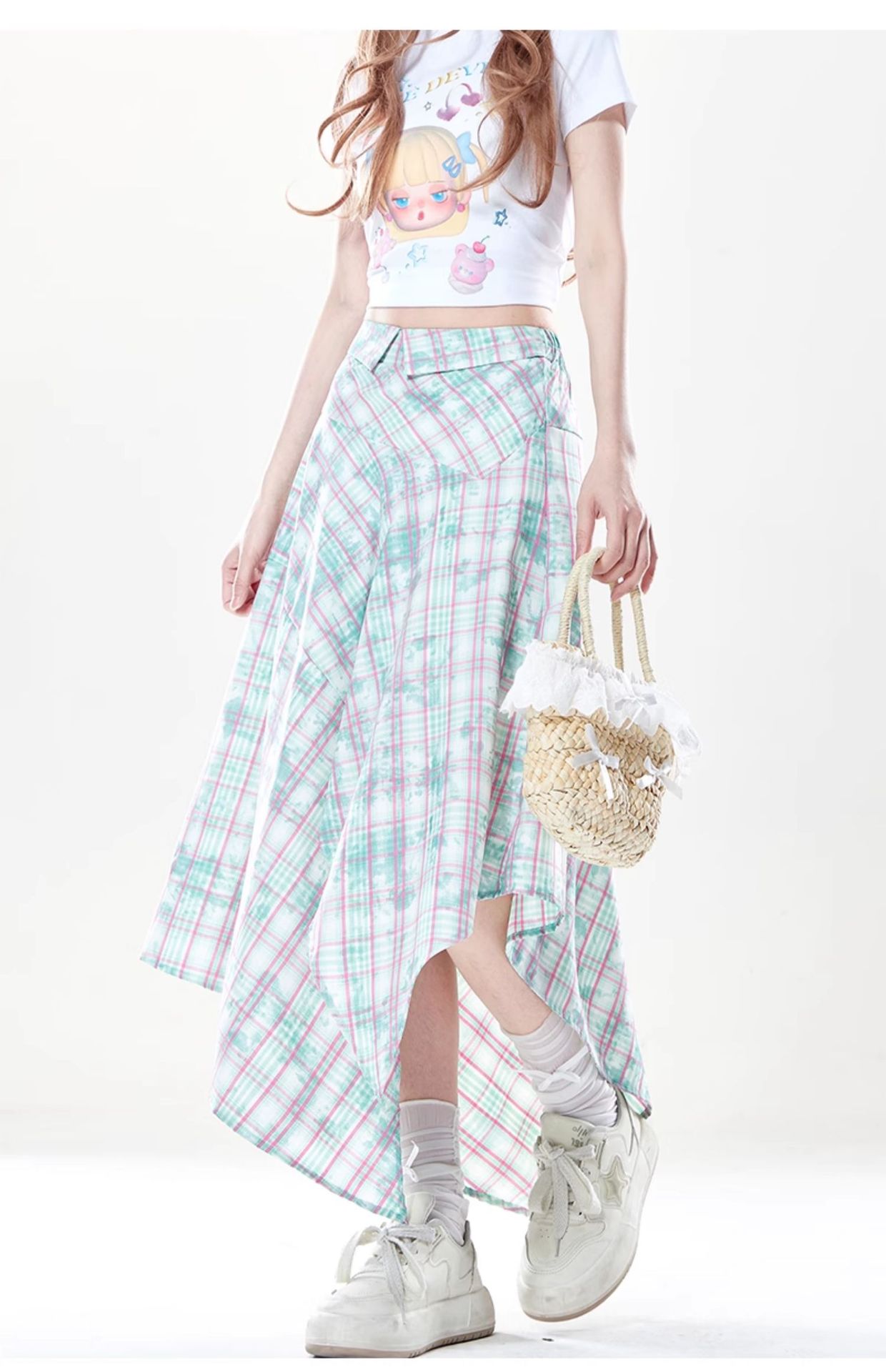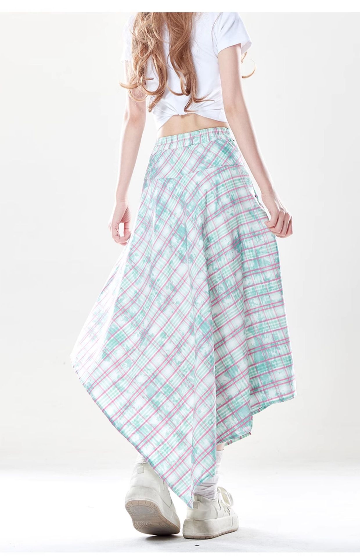 美式不規則翻腰頭設計感紮染格紋半身裙夏季休閒中長裙子