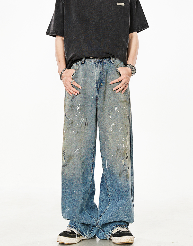 紮染潑墨直筒牛仔褲女美式高街做舊寬鬆拖地闊腿褲