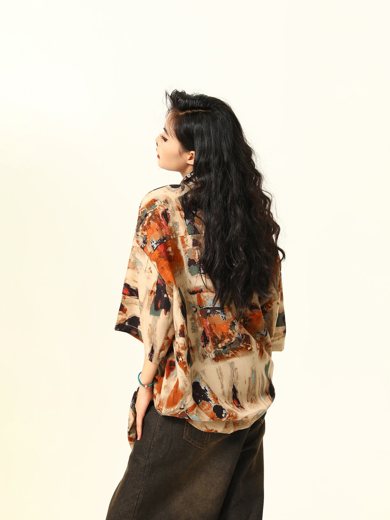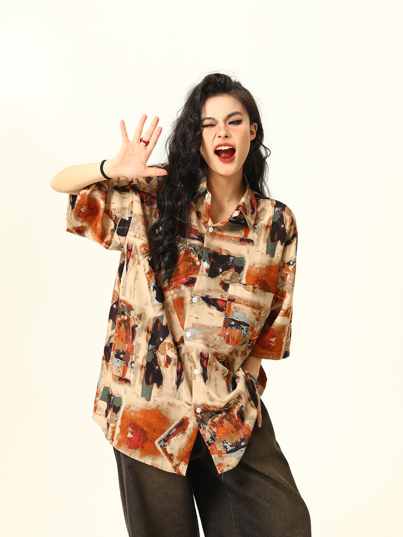 古著感油畫短袖襯衫女美式個性潮牌夏季寬鬆襯衣