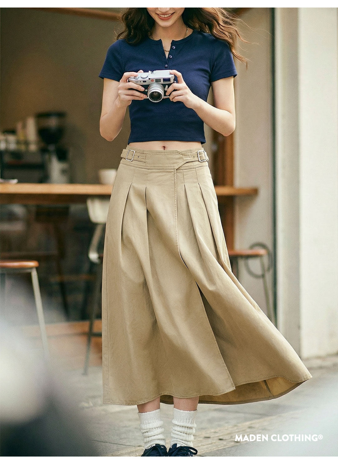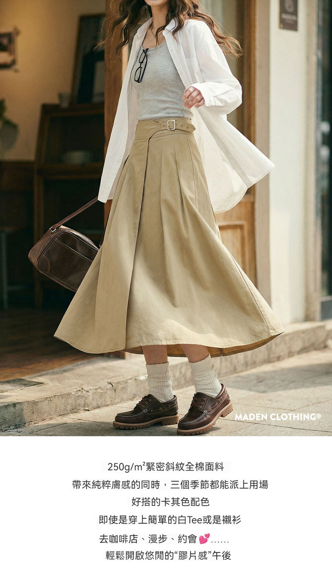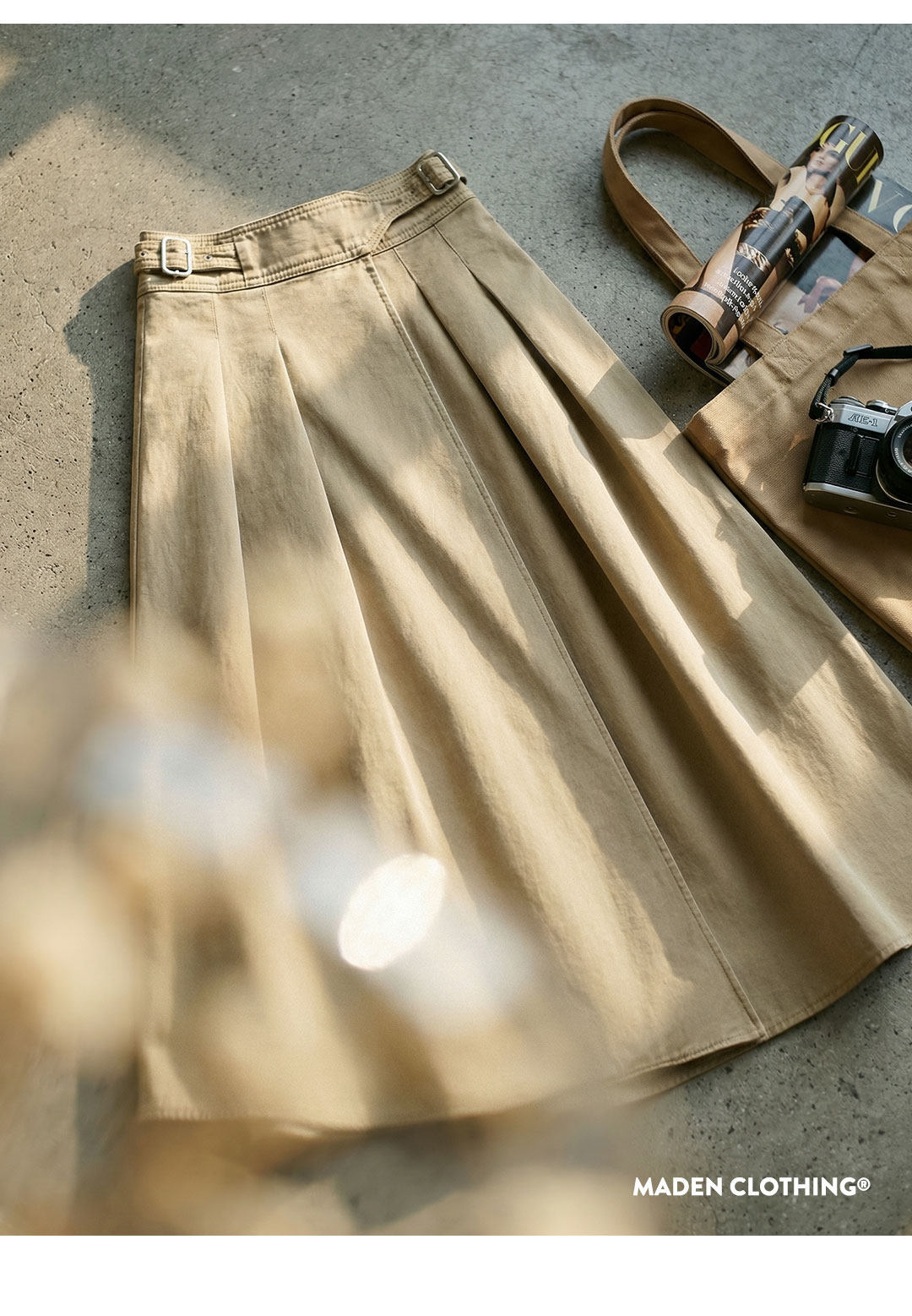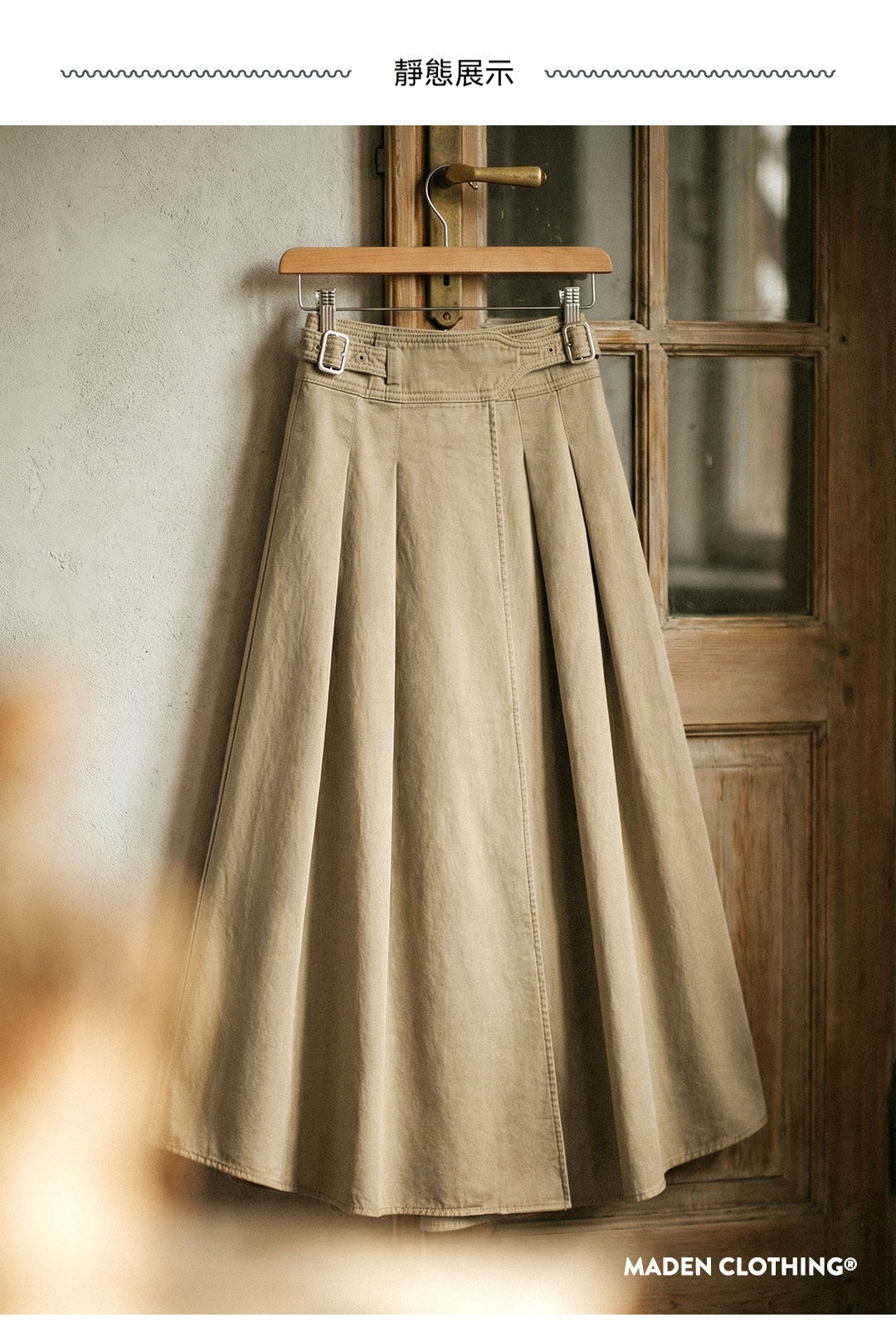 馬登女裝 復古卡其色廓爾格全棉百褶高腰A字大擺工裝傘裙子半身裙