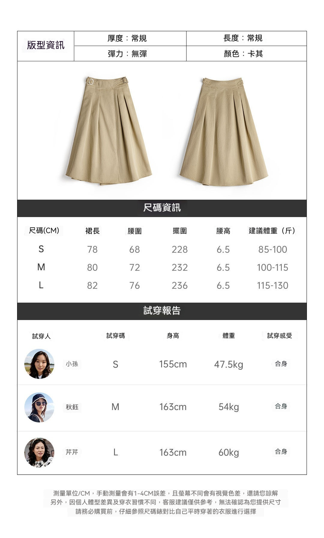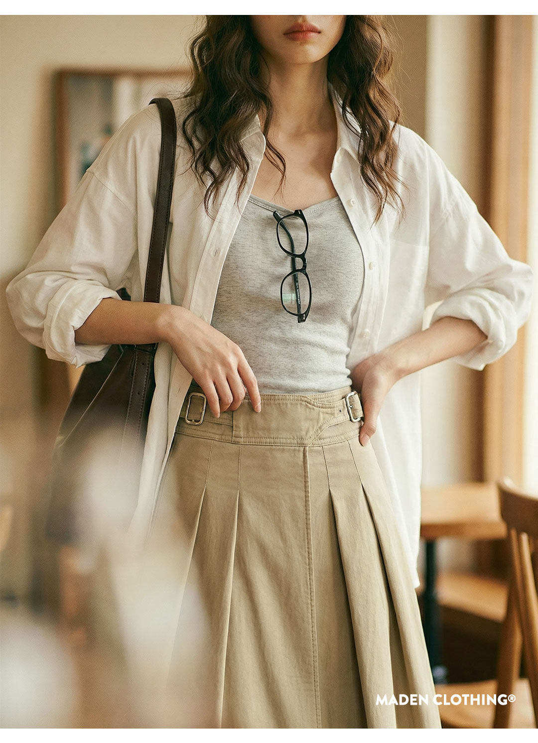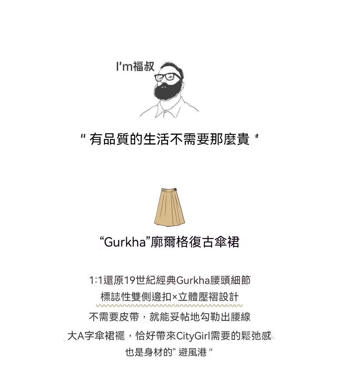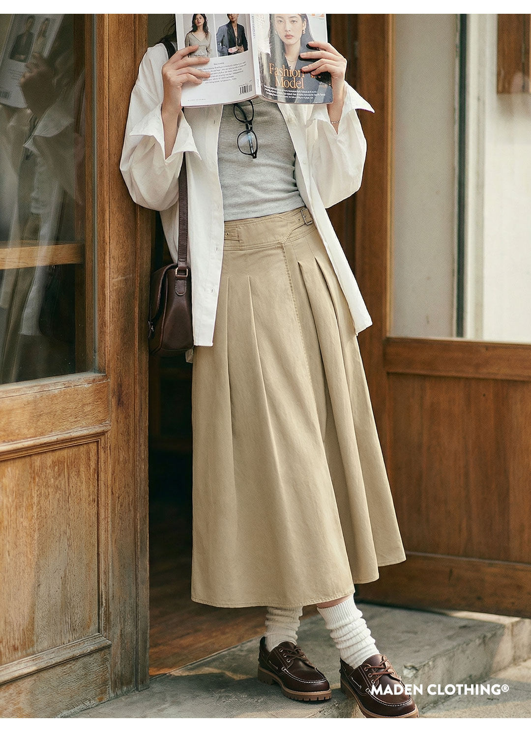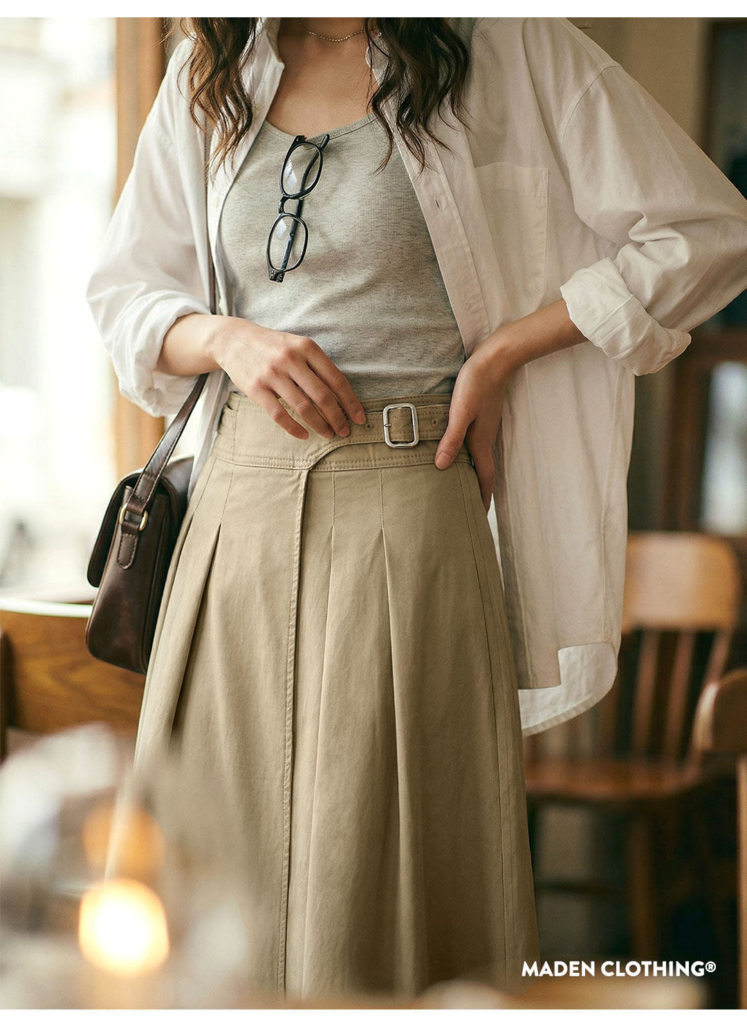 馬登女裝 復古卡其色廓爾格全棉百褶高腰A字大擺工裝傘裙子半身裙