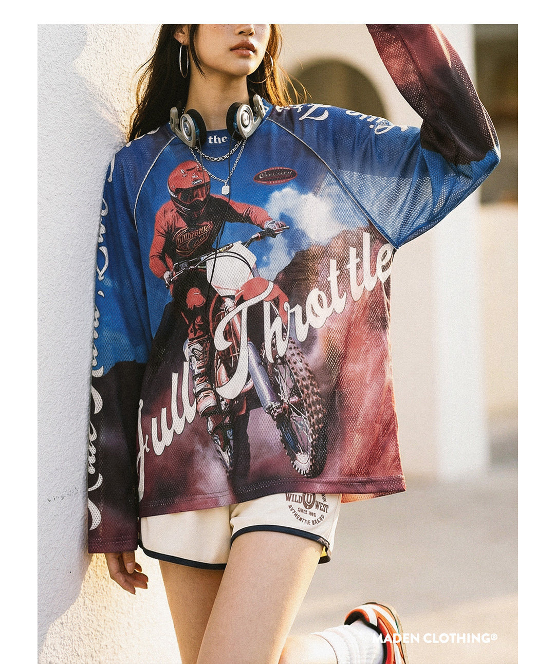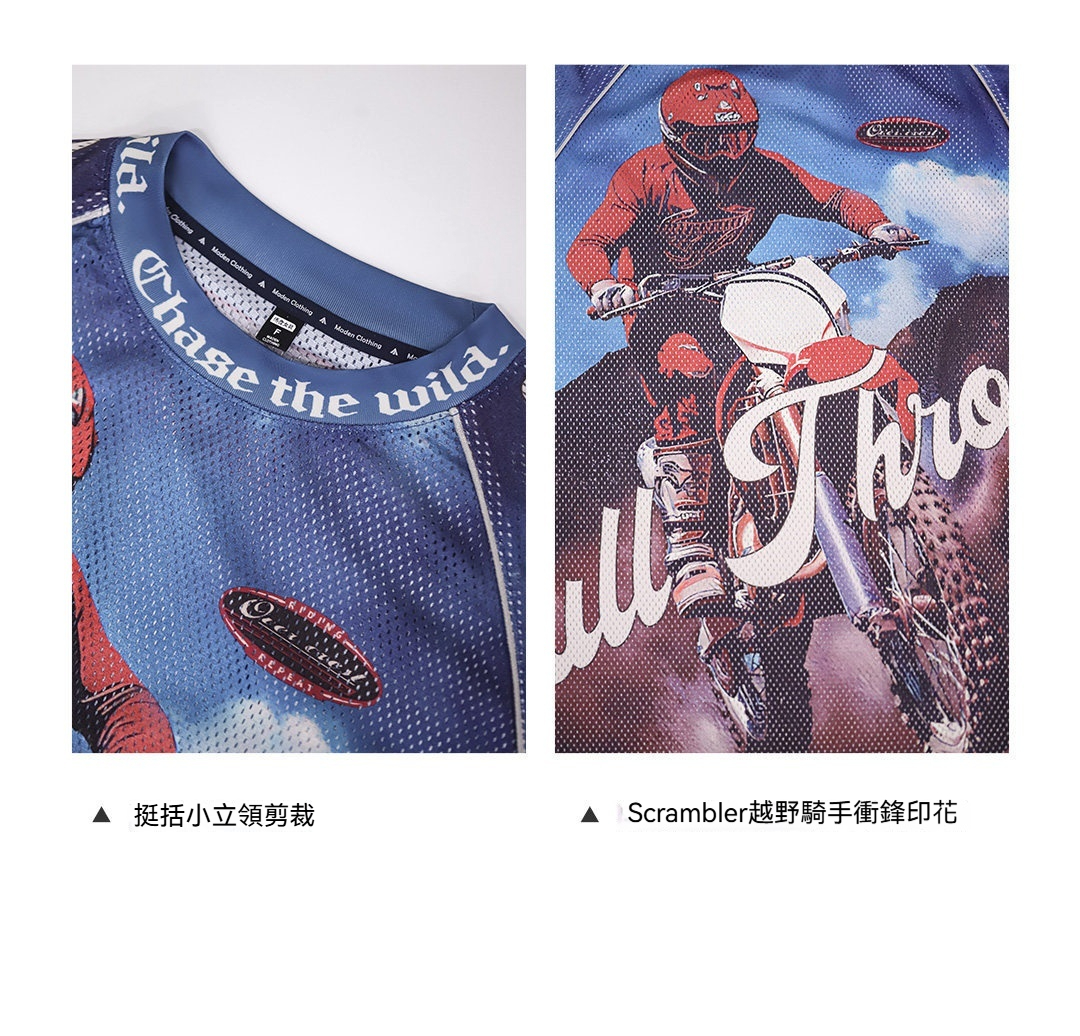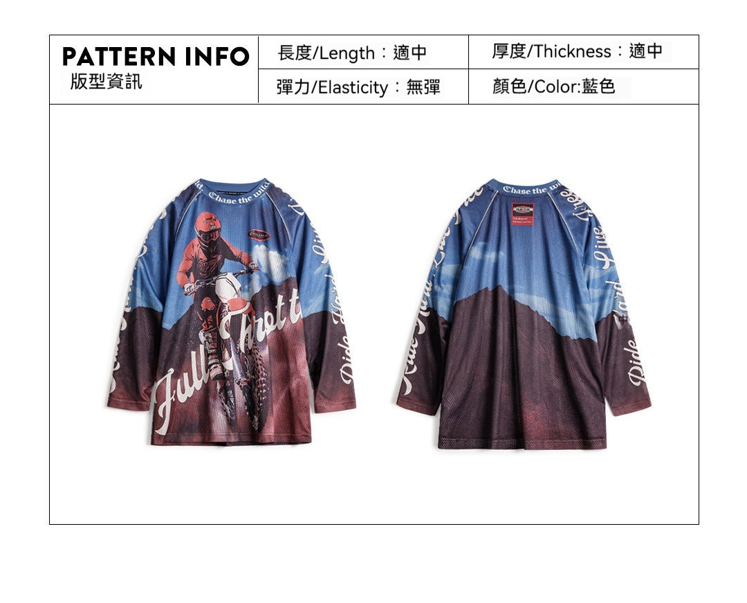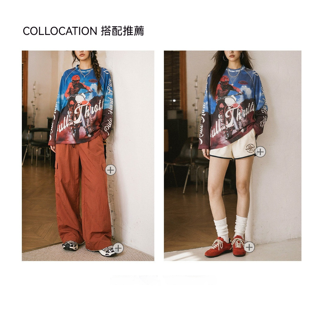 馬登女裝 美式復古針織滿印花長袖T恤薄款寬鬆立領套頭外穿上衣