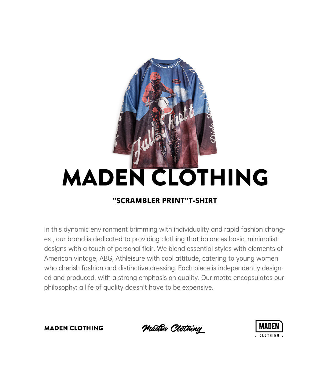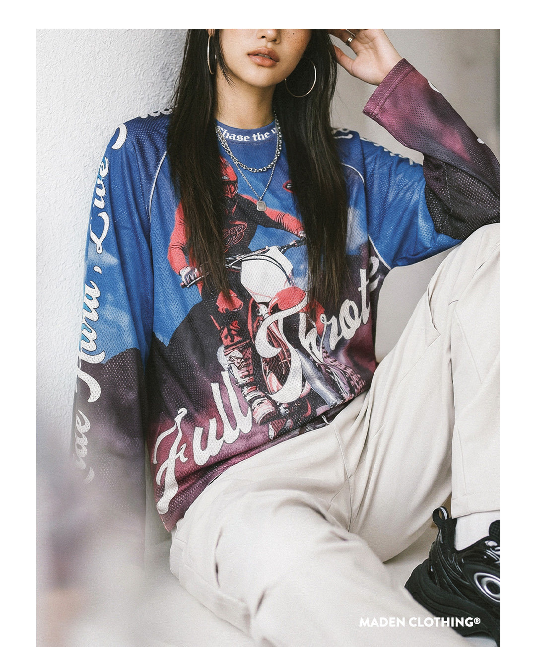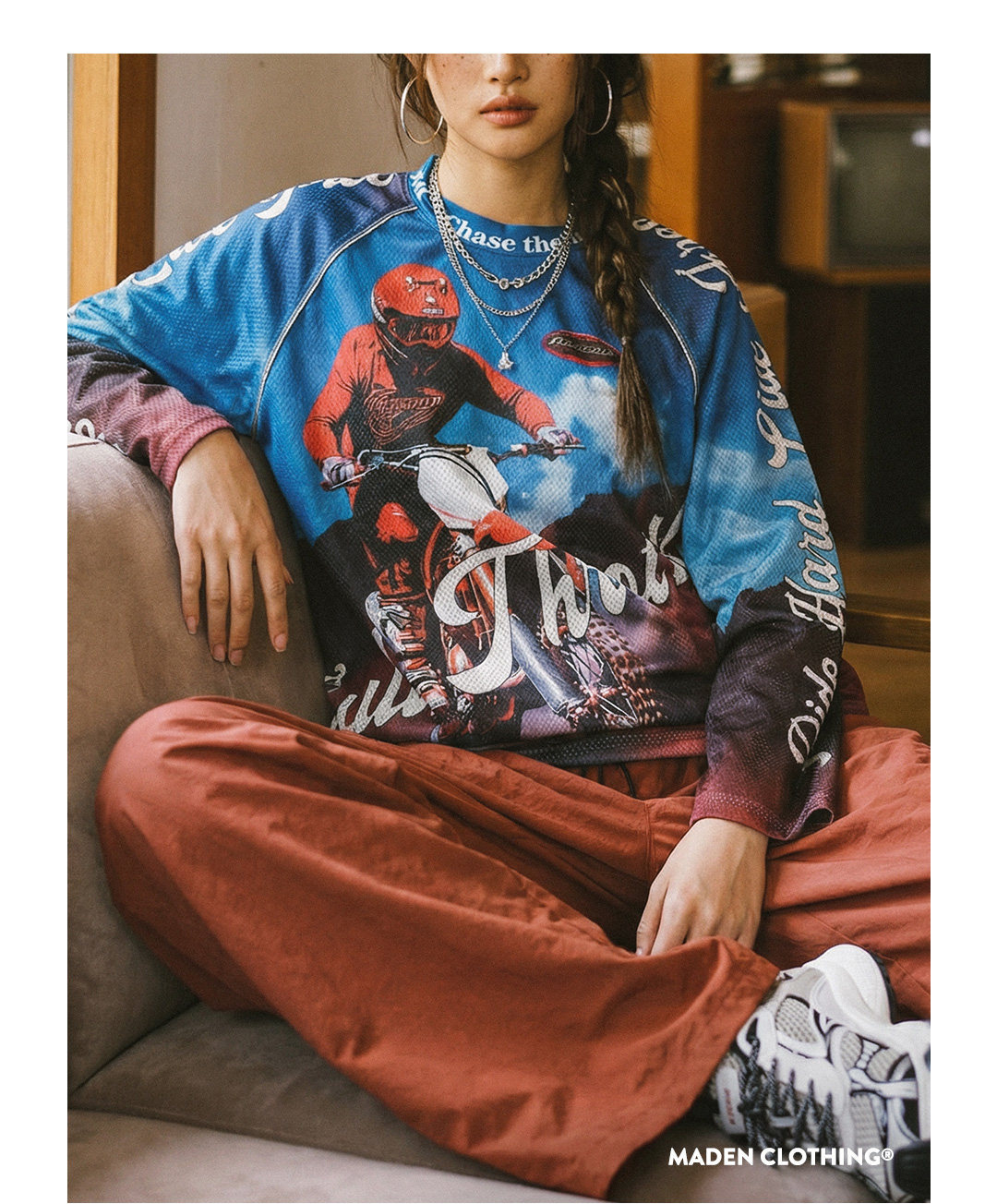 馬登女裝 美式復古針織滿印花長袖T恤薄款寬鬆立領套頭外穿上衣