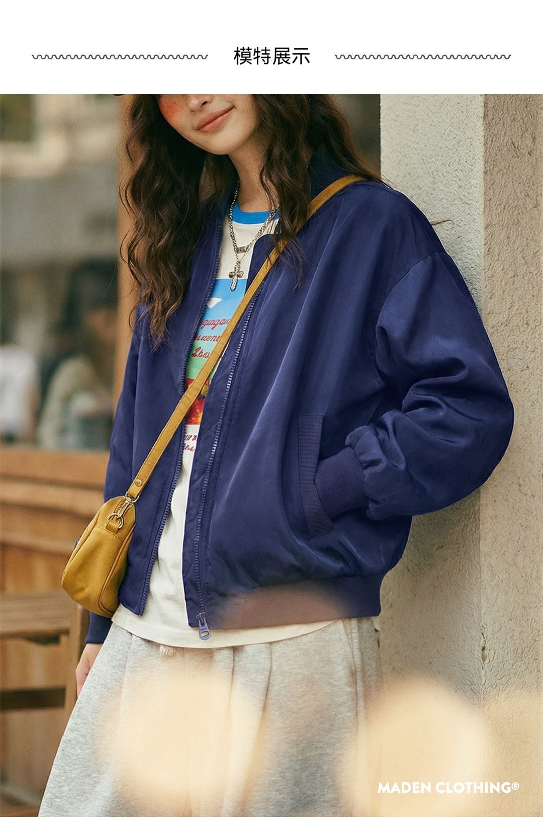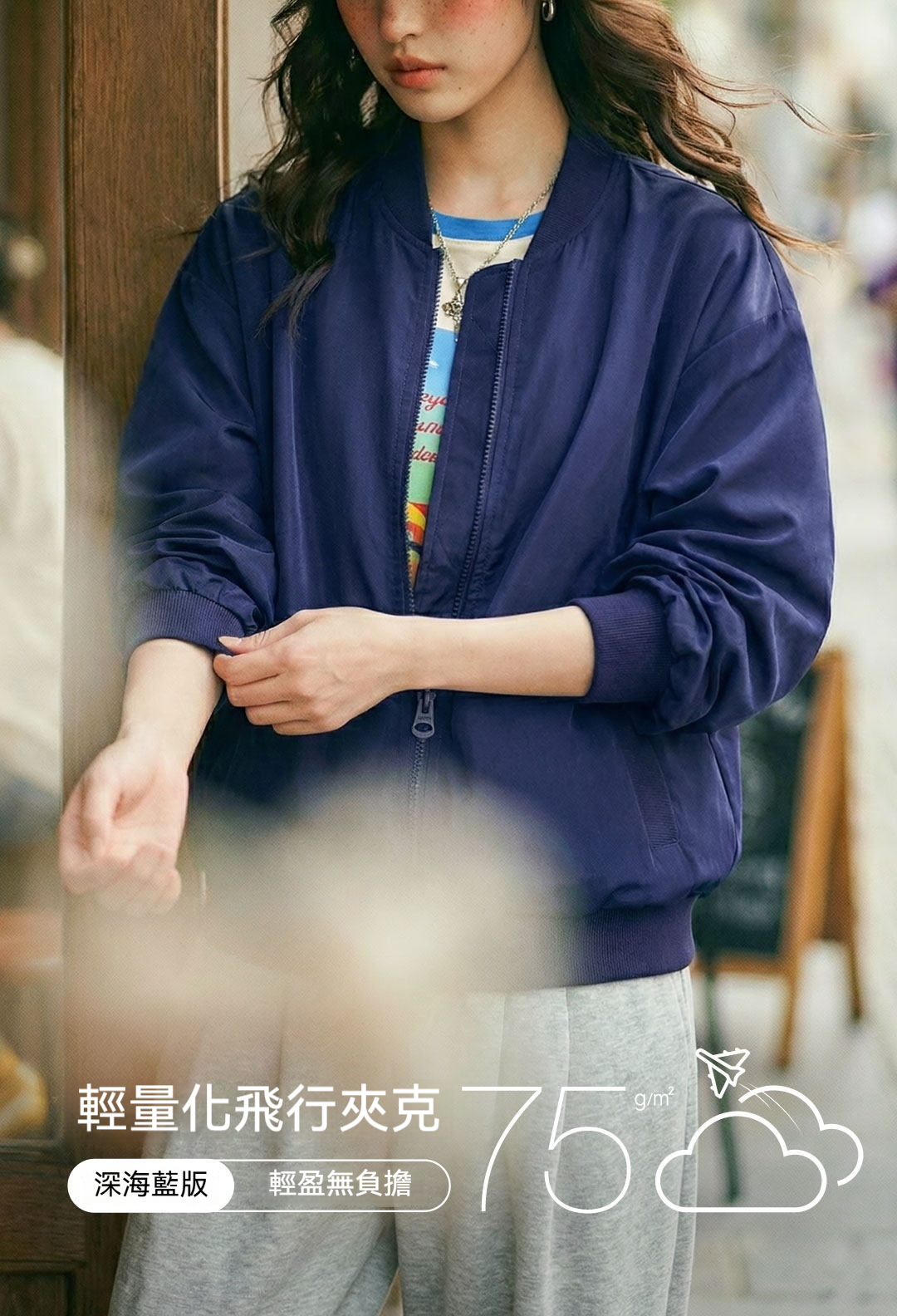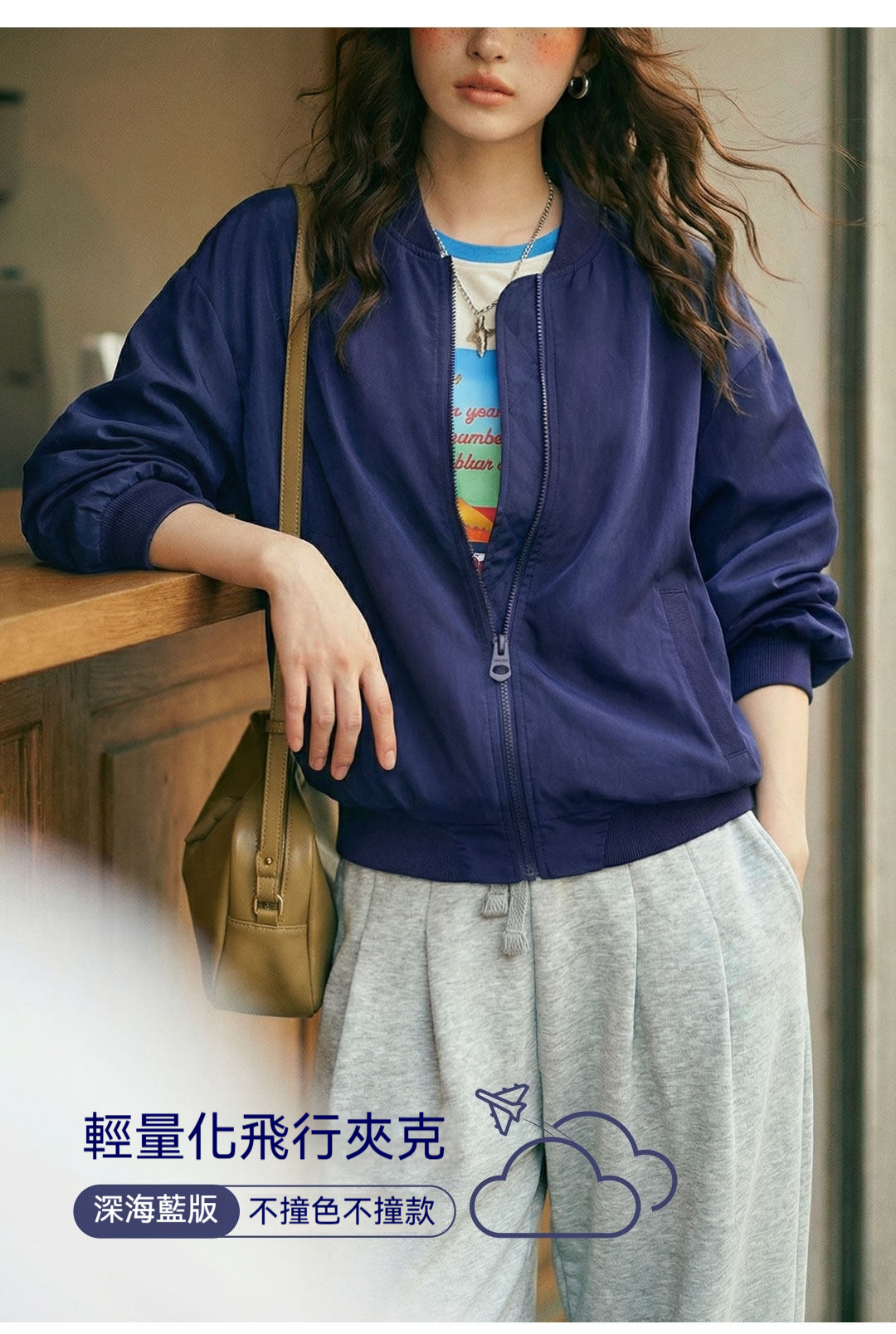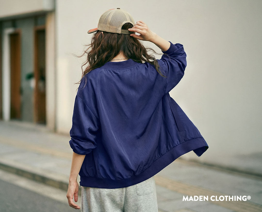 馬登女裝 深藍色美式復古輕薄款飛行員夾克棒球立領休閒工裝外套女士春