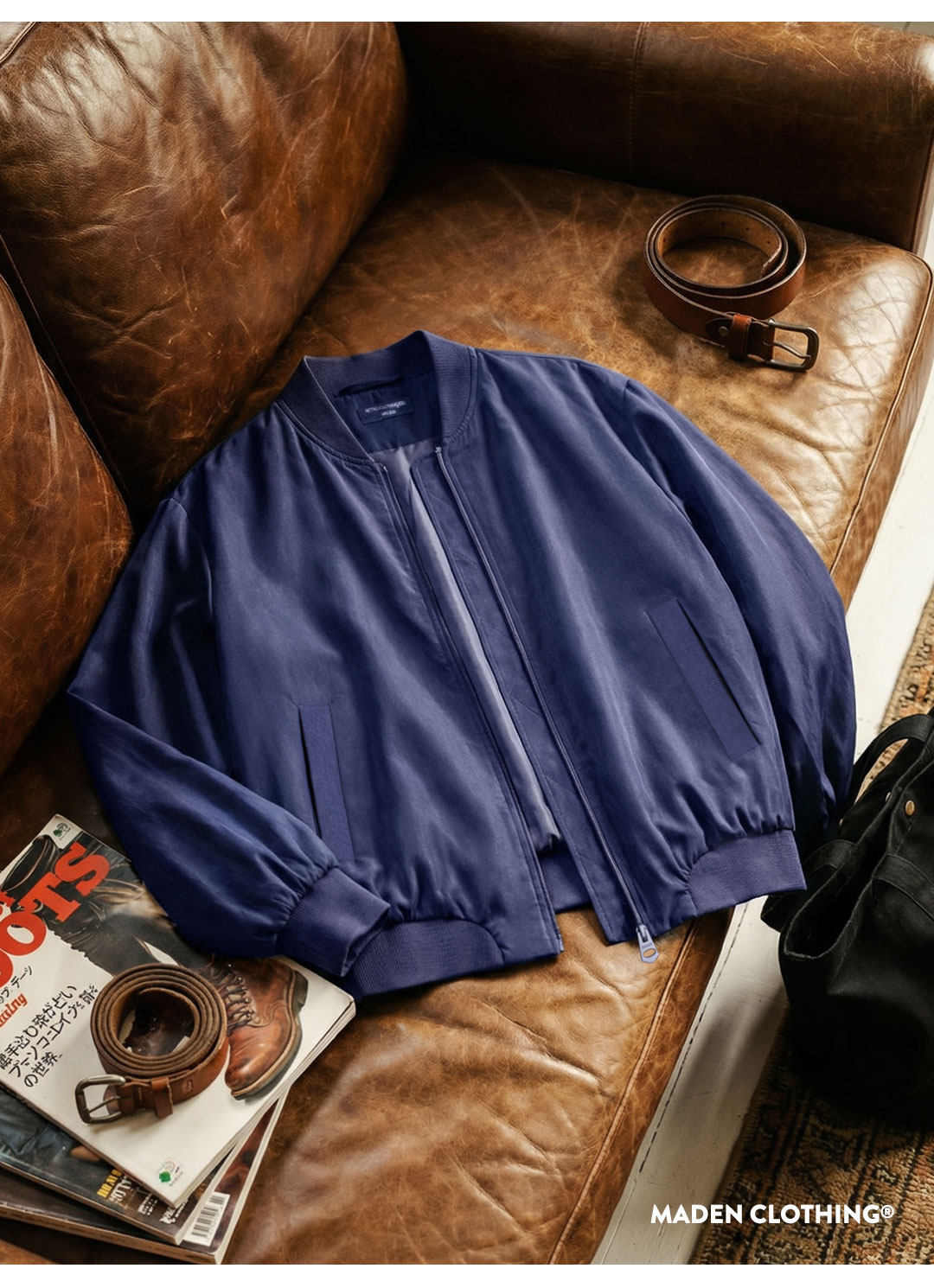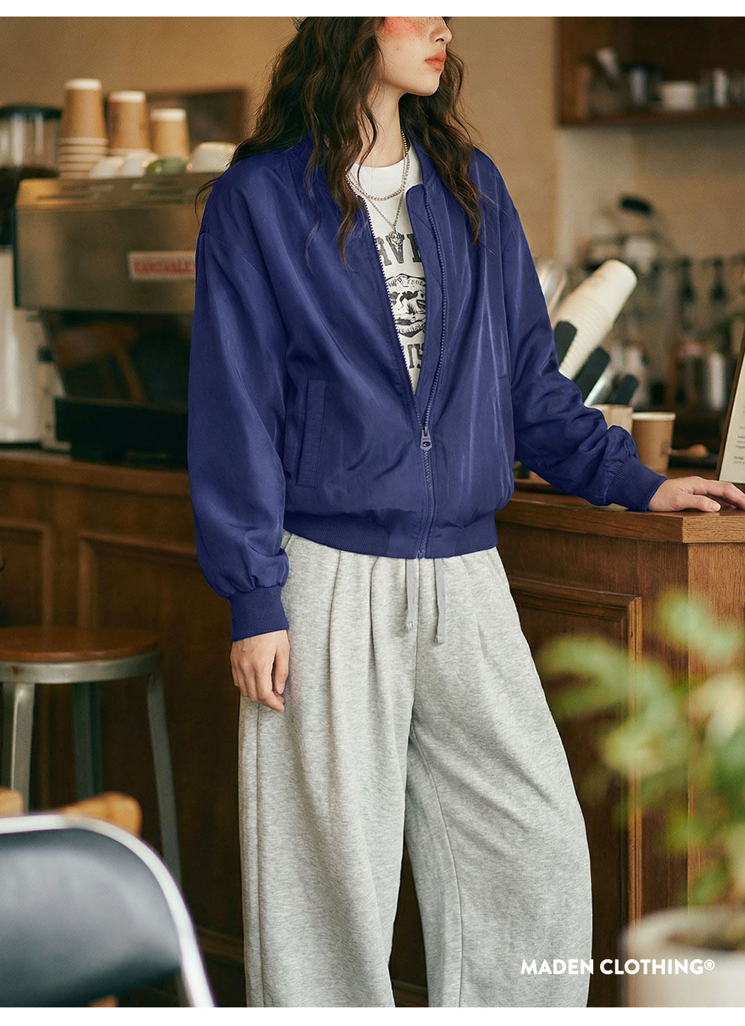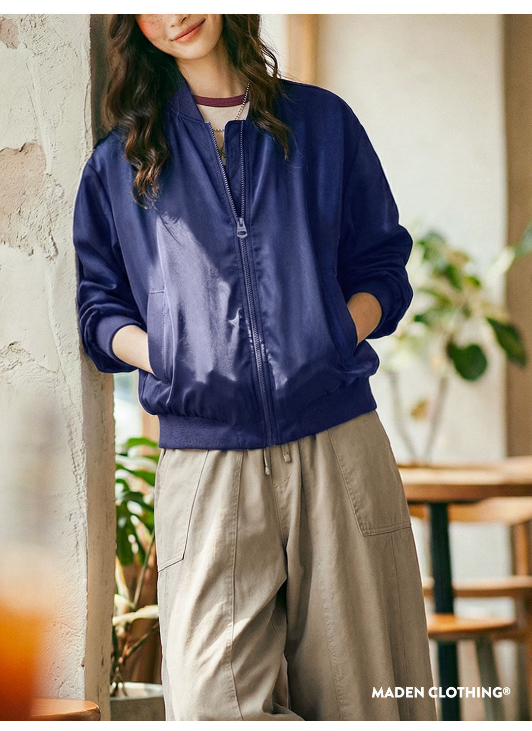 馬登女裝 深藍色美式復古輕薄款飛行員夾克棒球立領休閒工裝外套女士春