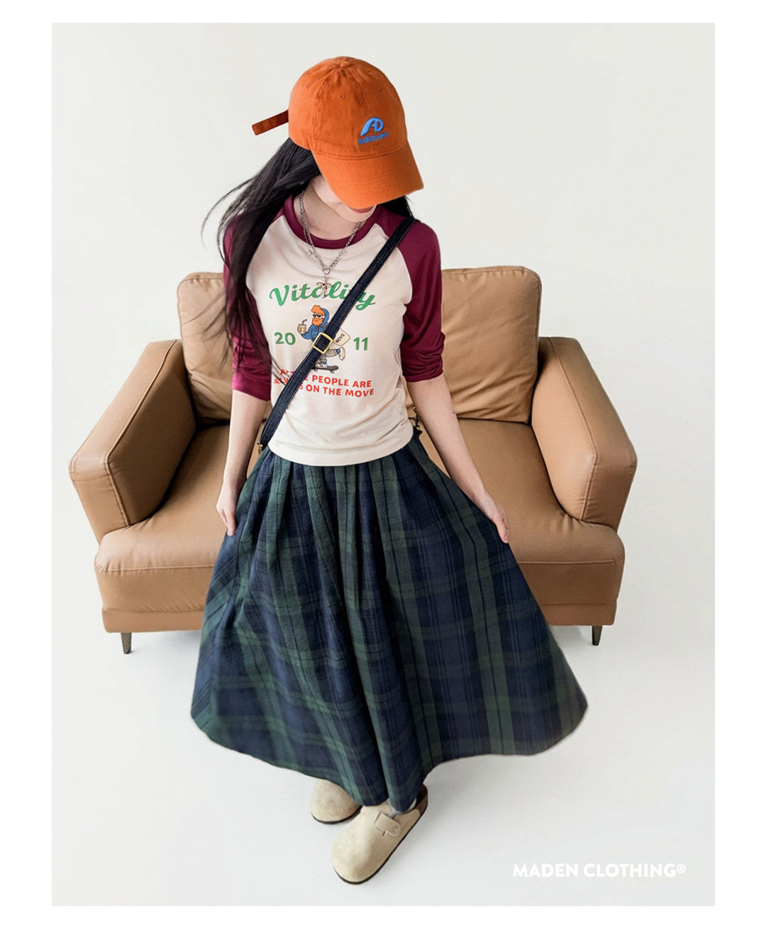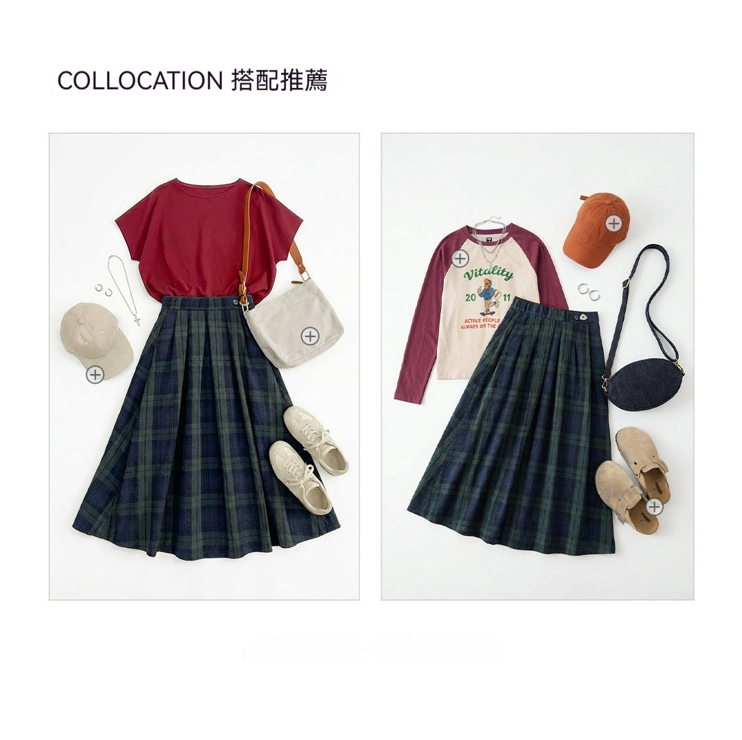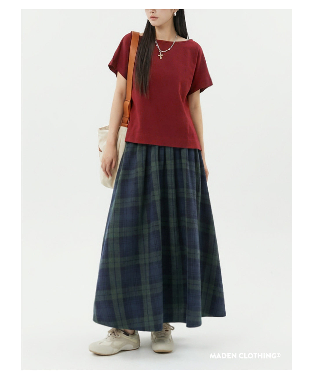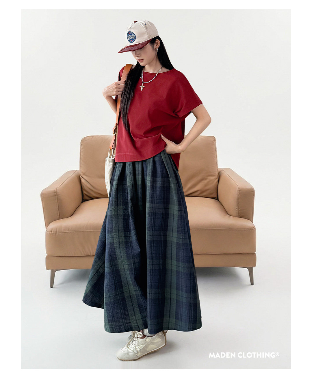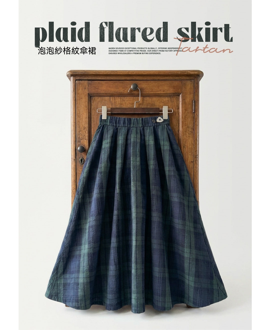 馬登女裝 復古泡泡紗格紋半身長裙全純棉鬆緊腰肌理感A字傘裙子女士春