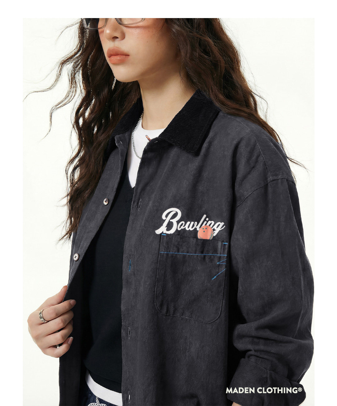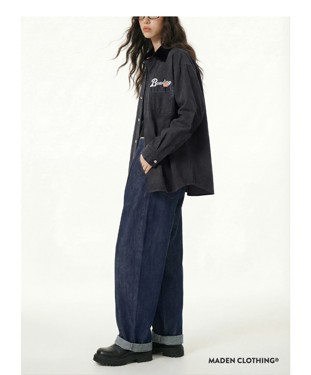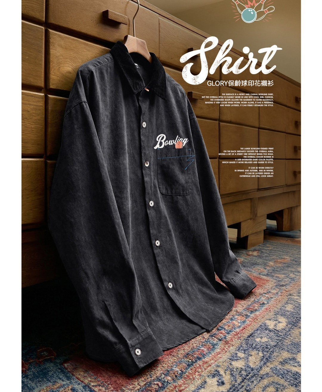 馬登女裝 黑色復古桃皮絨古巴領襯衫印花外套長袖襯衣內搭疊穿女士春